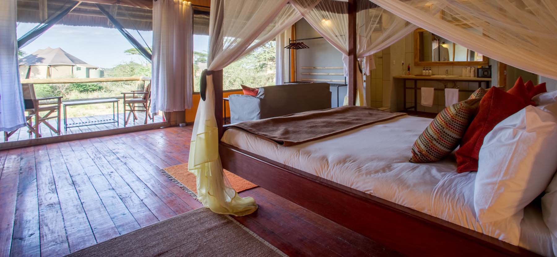 The thirty-six spacious and permanent tents of Lake Masek Tented Lodge are tastefully decorated and fully equipped. You can shower under the starry sky.