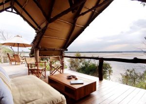 Below this Tanzania lodge on the Rufiji River is an attractive sitting area just above the river, where campfires are lit every night so that the visitor can enjoy the sound of the animals and birds in the evening, and hear the crickets sing as the waters flow by.